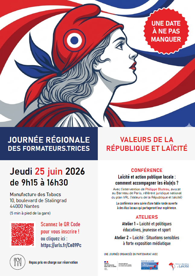Dans le cadre du déploiement du plan régional Valeurs de la République et Laïcité (VRL) en Pays de la Loire, la DREETS des Pays de la Loire organise en partenariat avec La Ligue de l’enseignement une Journée régionale des formateurs et formatrices VRL qui se tiendra le 25 juin 2026 à la Manufacture des tabacs à Nantes.